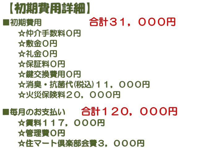 初期費用は火災保険と消臭抗菌代のみ!