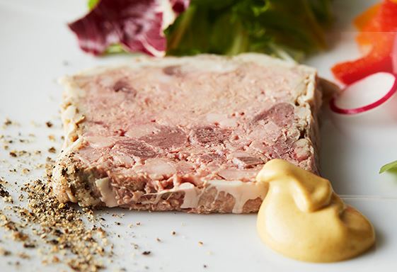 シェフの自信作、お肉のテリーヌはエゾ鹿肉、豚肉、鶏肉を贅沢にたっぷりと使用し、シンプルにお肉の旨味を楽しめる自慢の逸品です。