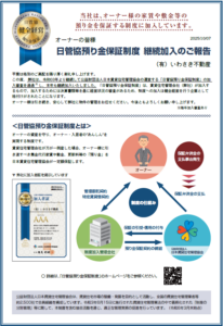 「日管協預り金保証制度」は、賃貸住宅管理会社が加入するもので、加入するためには決算書類等をもとに経営状況の審査が毎年あるため、制度への加入は健全経営を行う企業として格付けがされたことになります。